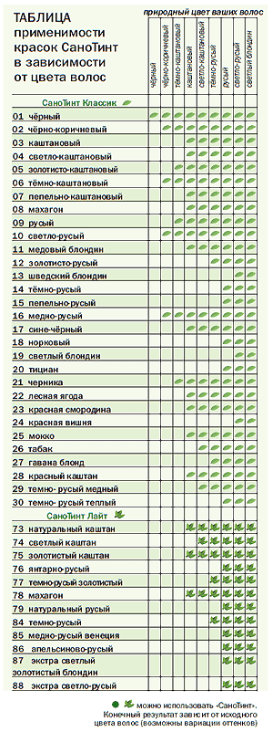 Таблиця застосовності фарб СаноТінт в залежності від кольору волосся